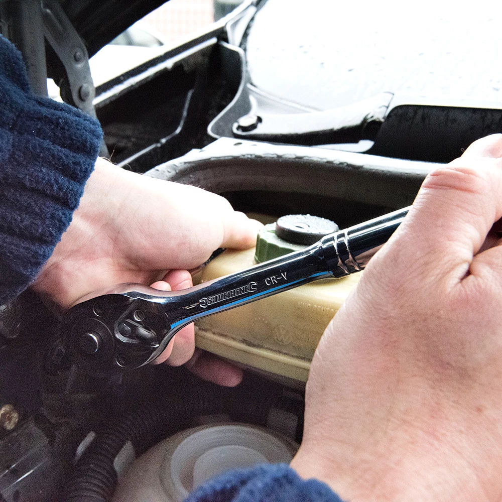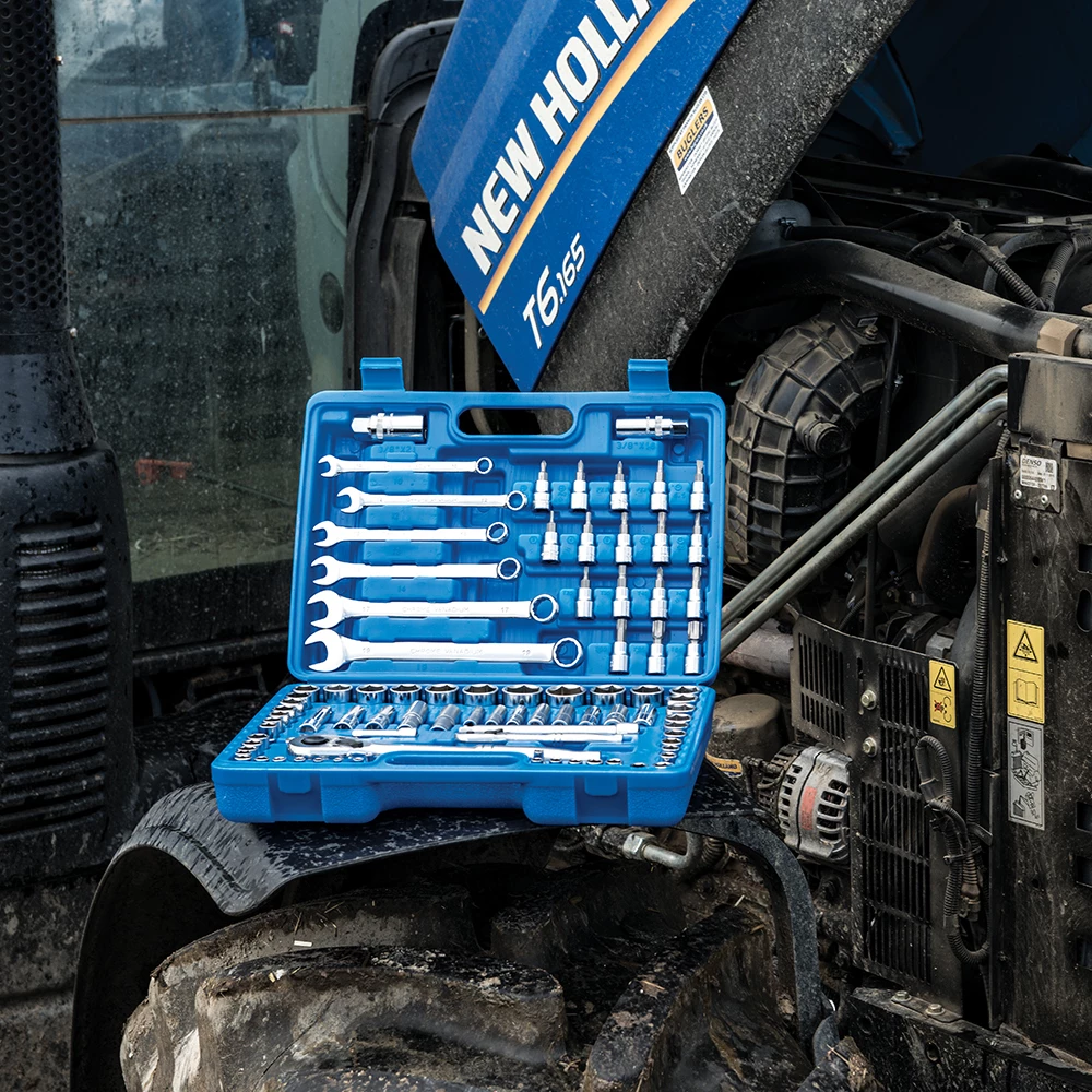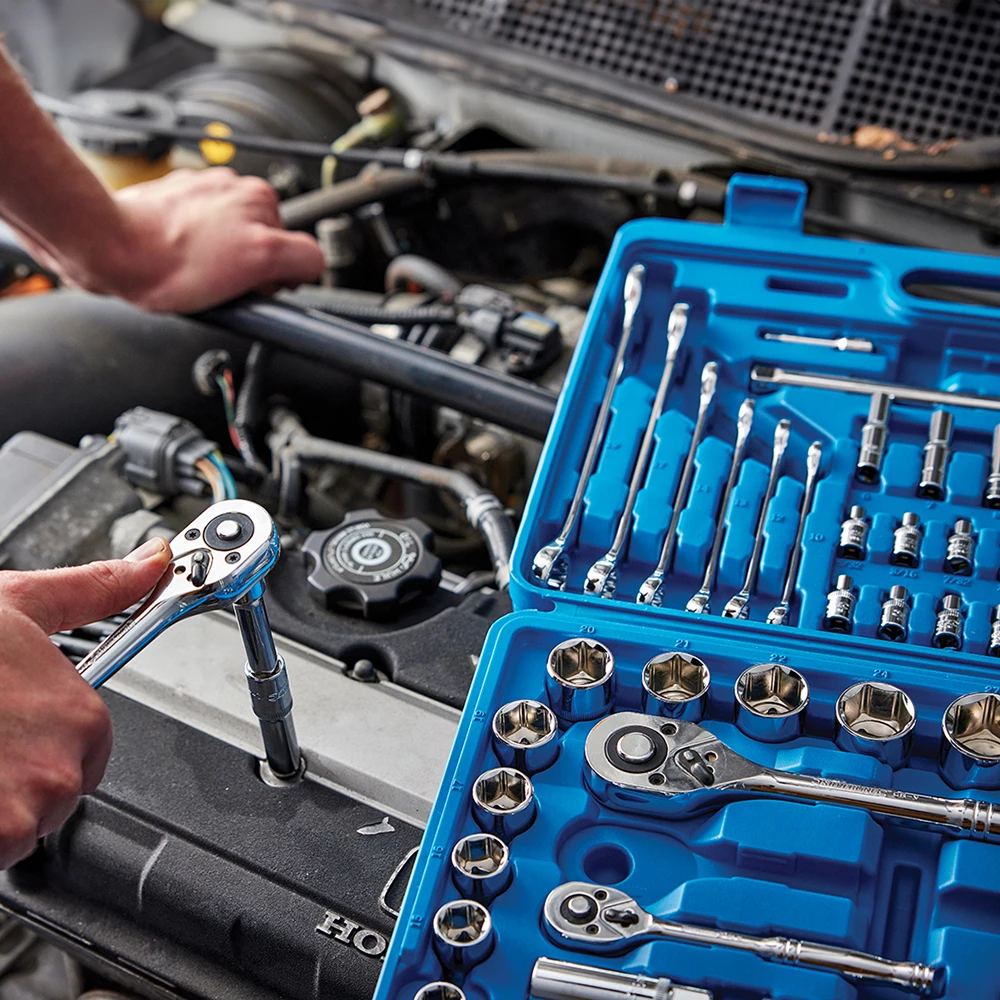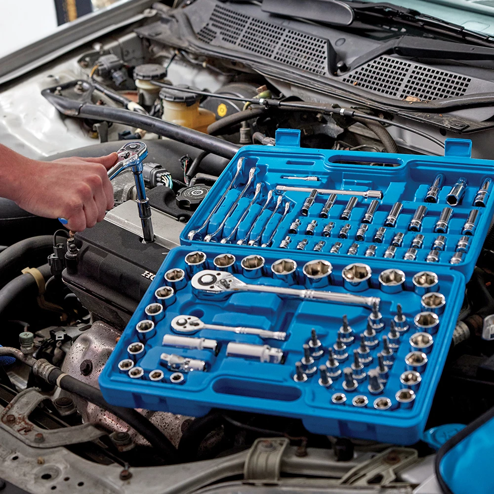 - Incluye llaves de vaso para bujías, prolongadores y 6 llaves combinadas de 10-19 mm